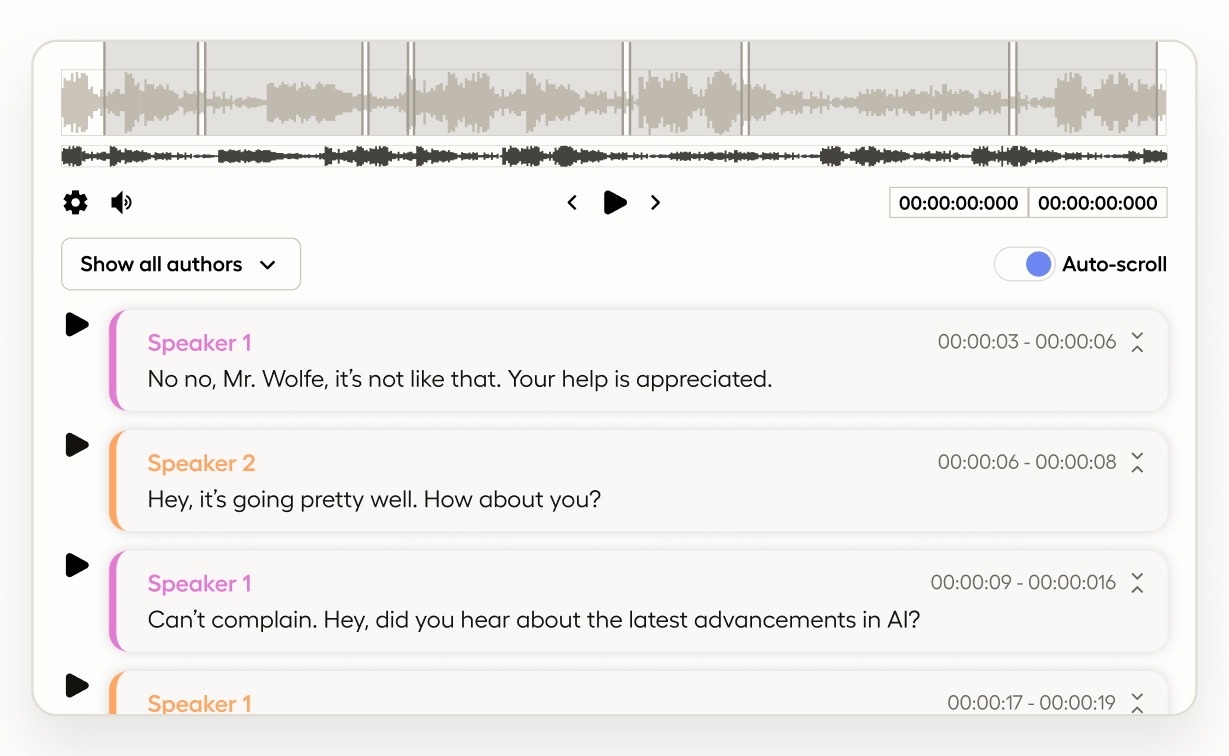 Playback synchronization between audio and corresponding paragraph segments provides you with enhanced context and control resulting in high-quality annotated datasets and increased productivity when performing conversational analysis.